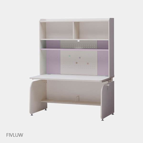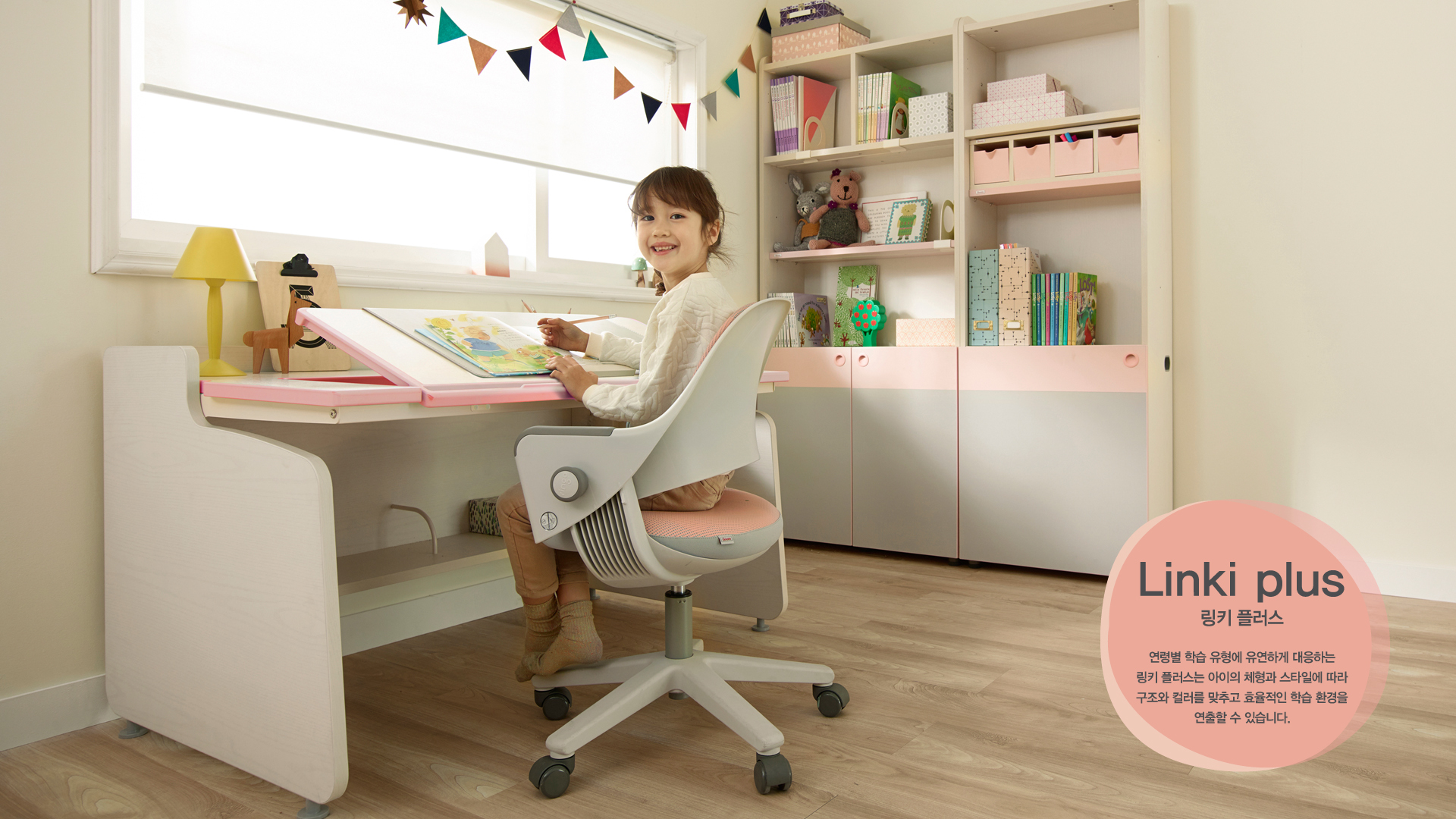 Linki-plus 書桌上書架)必須配合Smart Desk書桌使用,可增加收納空間,上部可加裝門板美化外觀。連接支架將書桌櫃牢牢固定在側板型書桌上方;設有打孔的鐵製掛飾收納板,可另外購買Linki-plus裝飾組合或直接以磁鐵黏貼便條紙;堆層櫃的中間隔板可調整高度,以符合使用者的使用需求。